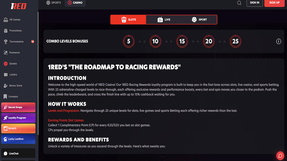 1RED Casino features a comprehensive loyalty program titled “The Roadmap to Racing Rewards.” This 25-level system is designed to keep players in the fast lane, offering a clear path of progression.