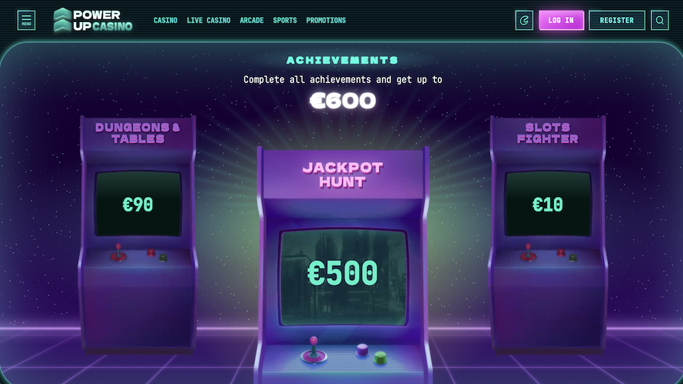 The Achievements system at PowerUp Casino is an immersive, arcade-inspired feature that allows players to unlock cash rewards by reaching specific milestones in their gaming journey. By completing all available tasks, players can earn a total of up to €600.