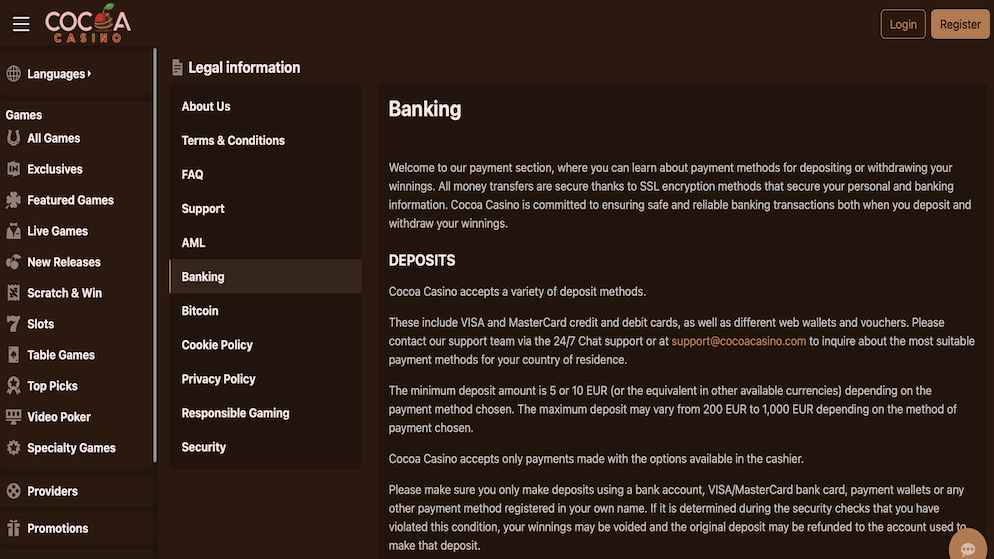 - Bitcoin: This is the recommended method at Cocoa Casino. Bitcoin deposits are instant, have no fees, and often trigger better bonus offers.
